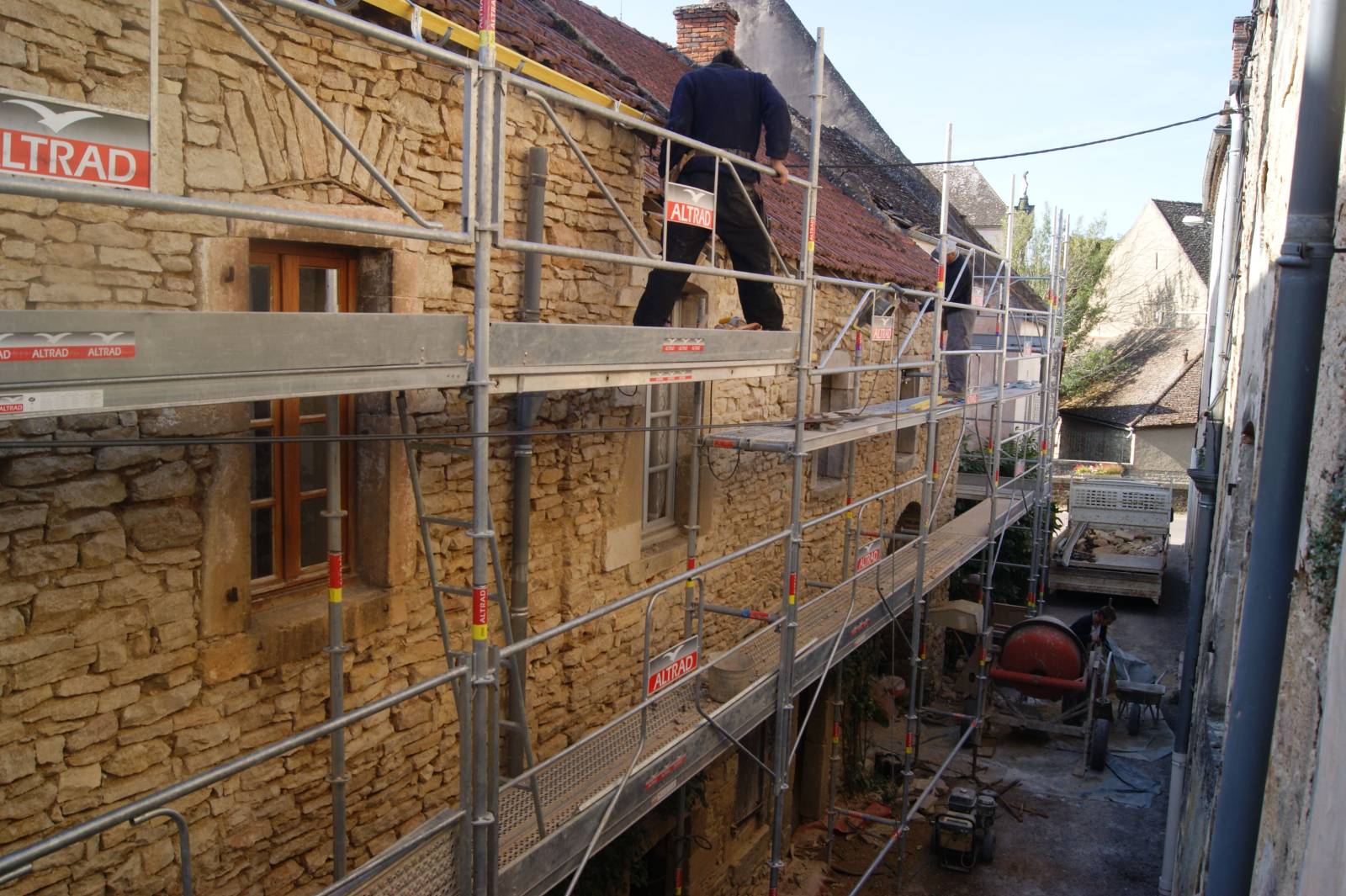 Après la mise en place d’un échafaudage conforme et des protections nécessaires, l’ancien crépi a été piqué, puis le parement en pierres nettoyé à haute pression.