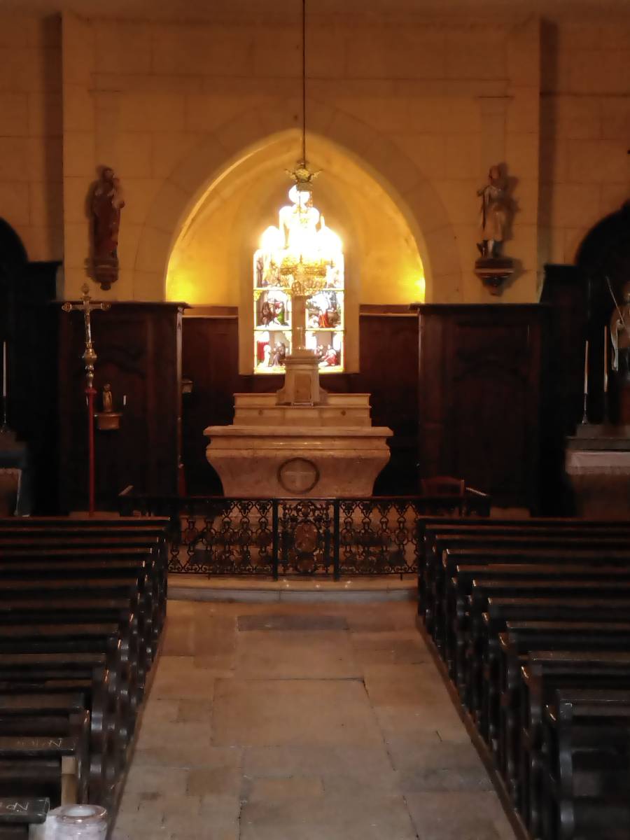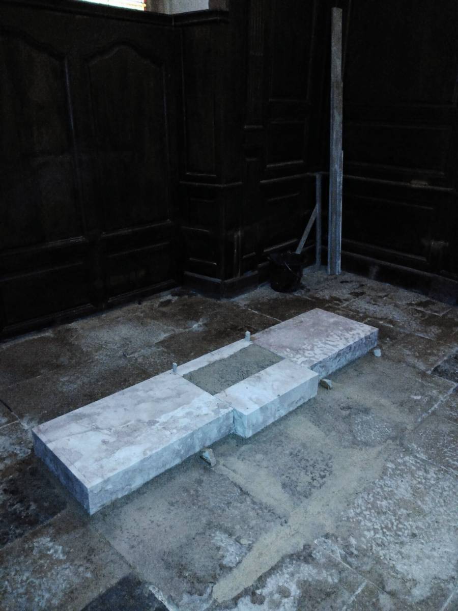 En accord avec la Fondation du Patrimoine, nous avons réalisé un socle en marbre de Ladoix (une pierre locale aujourd’hui non exploitée) ainsi qu’une base en pierre de Semond. Des placages en marbre de Carrare et de Ladoix ont été ajoutés pour compléter le maître-autel, assurant une parfaite intégration avec les teintes et matériaux du tabernacle, conservé dans l’une des chapelles de l’église.