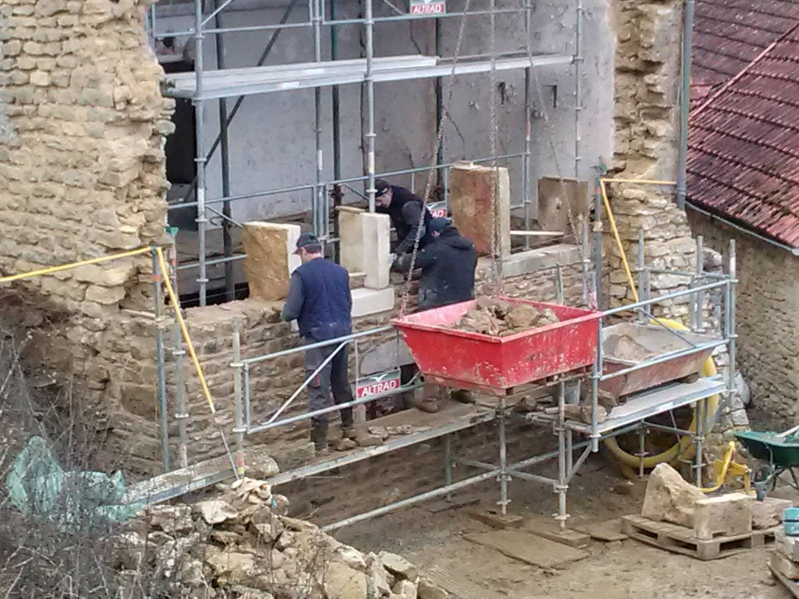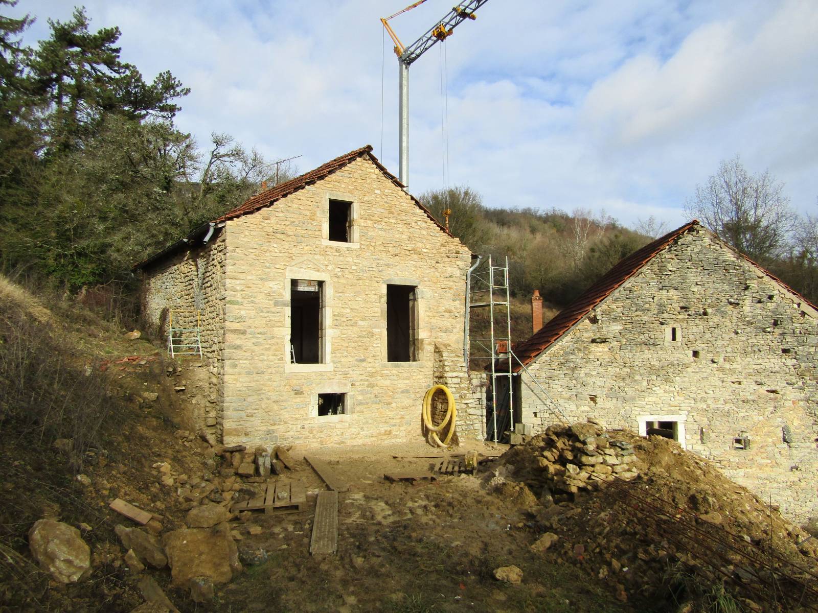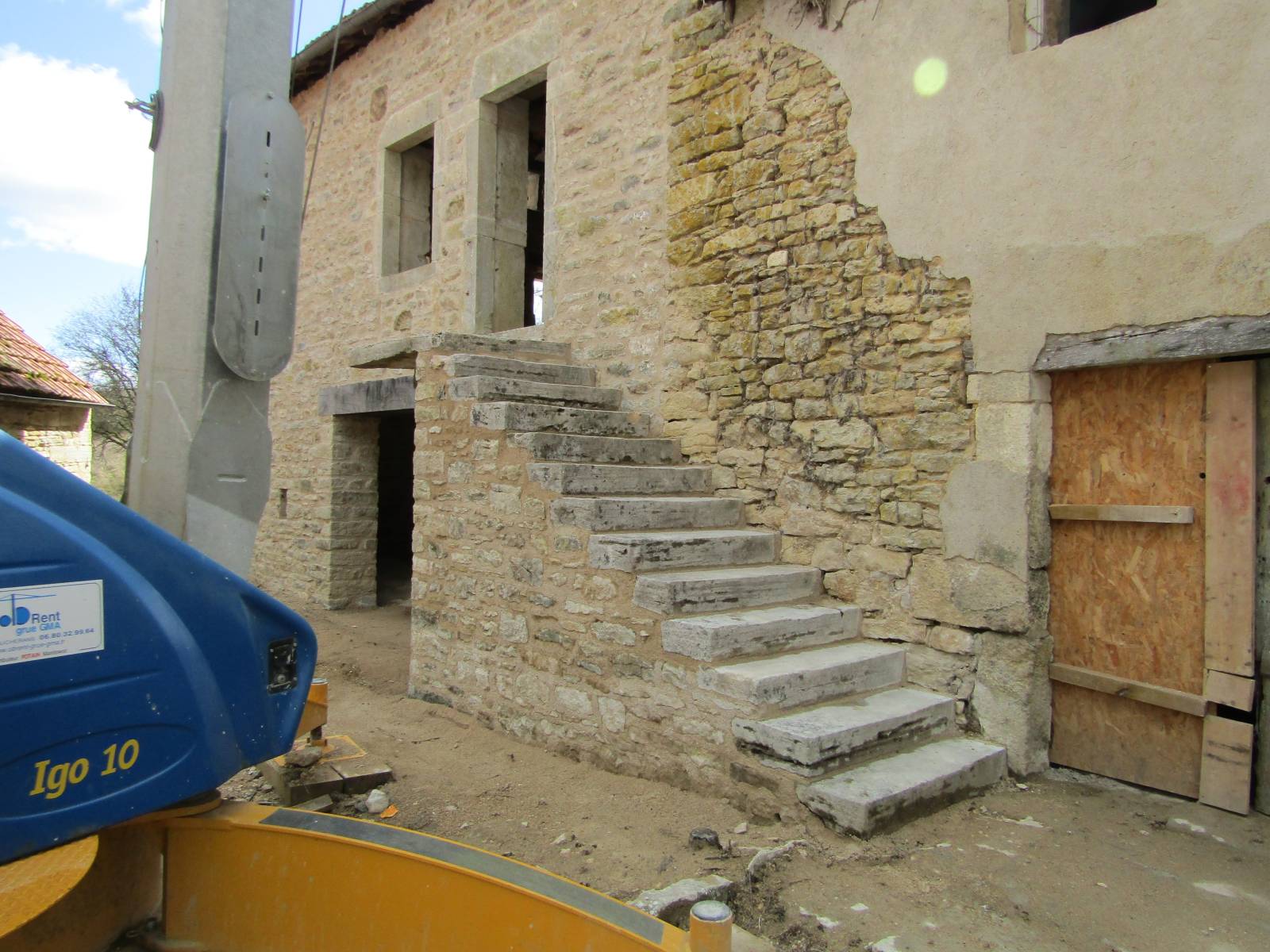 Dans un premier temps, nous avons démoli les maçonneries fragilisées dues à l'éboulement d'un mur pignon. L'échafaudage réglementaire et la grue mis en place, nous avons coulé une fondation en béton armé. Les pierres de réemploi ont ensuite été maçonnées, tout en reconstituant les ouvertures en pierres de taille anciennes. Les pierres de récupération ont toutes été hourdées au mortier de chaux hydraulique Saint-Astier. Les planchers en bois et la charpente ont été bloqués et renforcés au fur et à mesure de la maçonnerie.