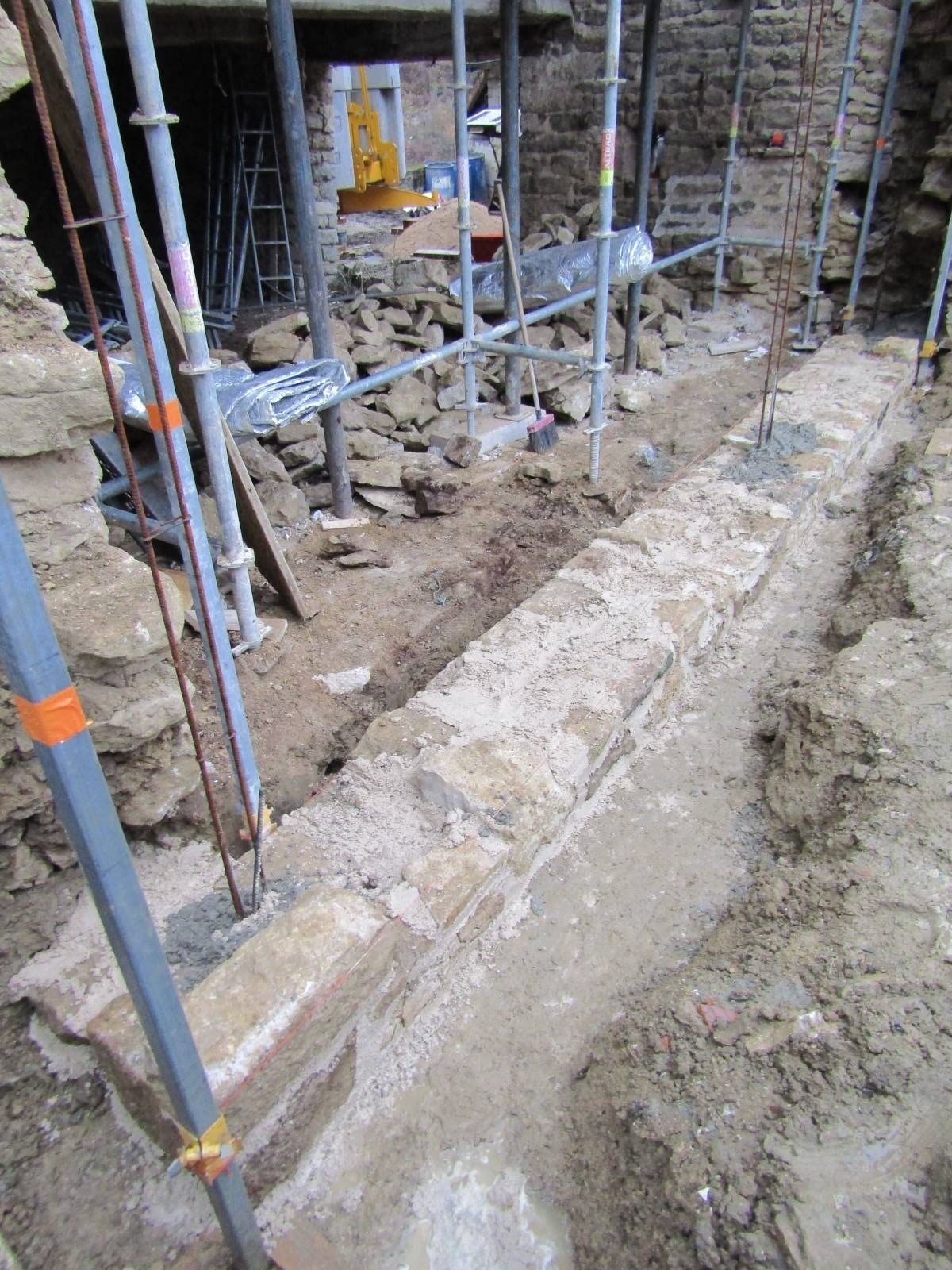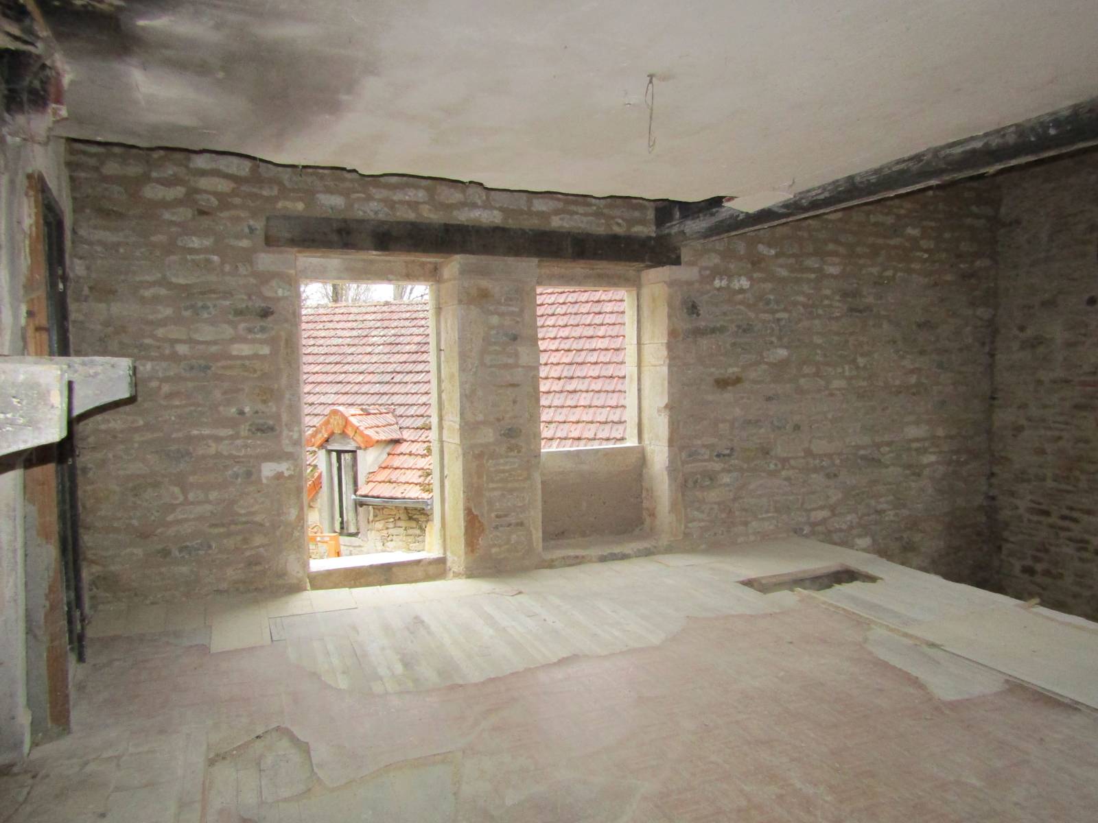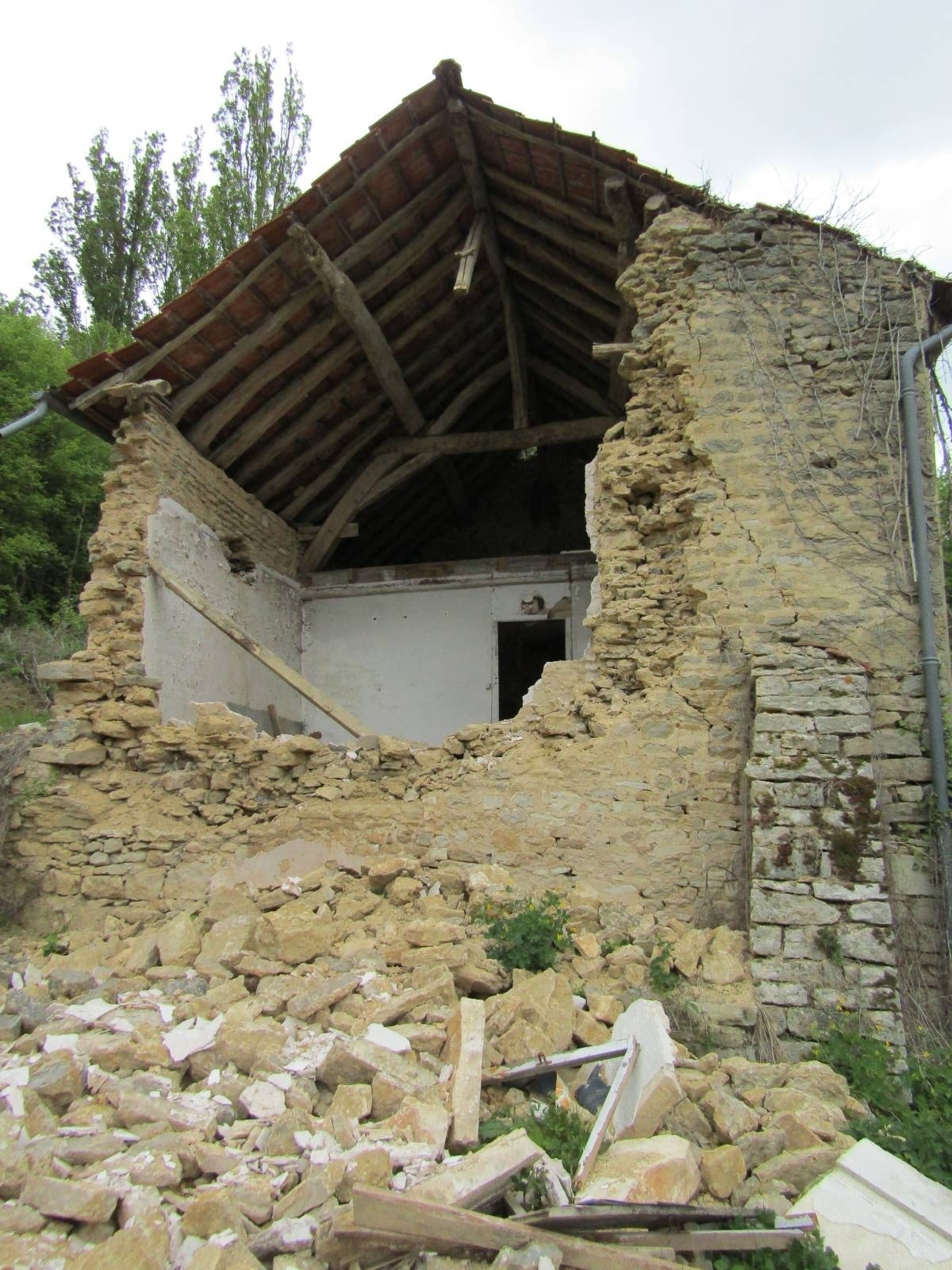 Dans un premier temps, nous avons démoli les maçonneries fragilisées dues à l'éboulement d'un mur pignon. L'échafaudage réglementaire et la grue mis en place, nous avons coulé une fondation en béton armé. Les pierres de réemploi ont ensuite été maçonnées, tout en reconstituant les ouvertures en pierres de taille anciennes. Les pierres de récupération ont toutes été hourdées au mortier de chaux hydraulique Saint-Astier. Les planchers en bois et la charpente ont été bloqués et renforcés au fur et à mesure de la maçonnerie.