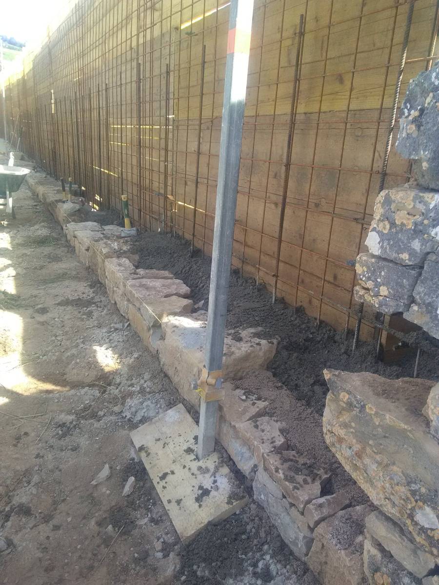 Dans un premier temps, nous avons démoli l'ancien mur en récupérant un maximum de pierres. Une fouille a ensuite été terrassée et une fondation en béton armé a été coulée.