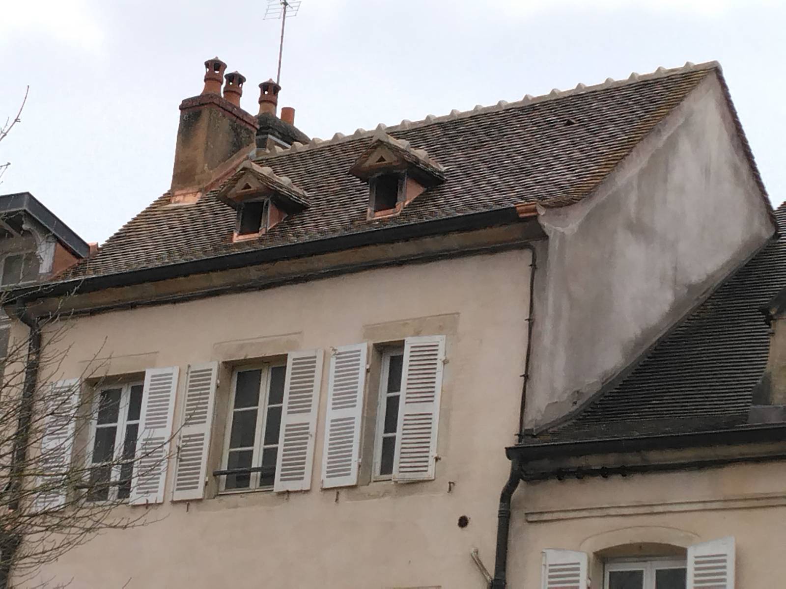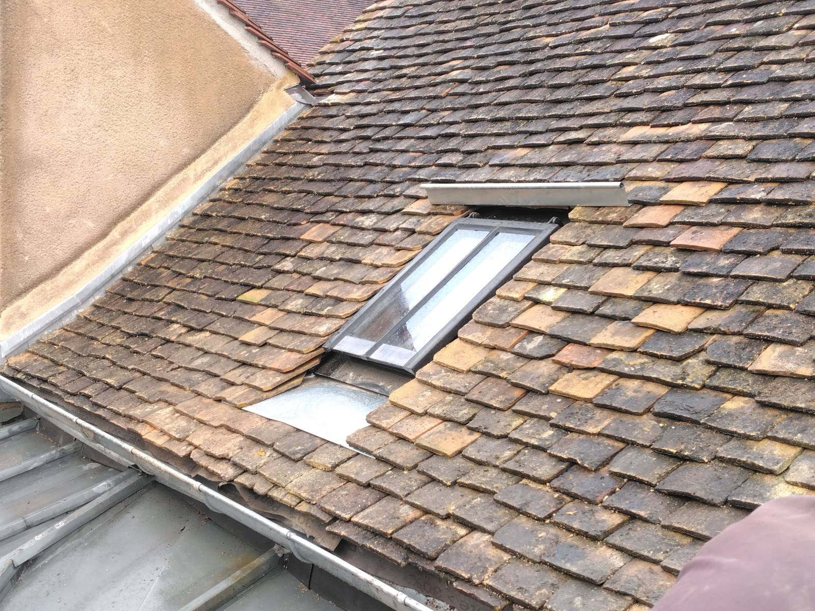 Pour ce chantier, la SARL René l'Excellent a été contactée par un propriétaire pour restaurer la couverture d'une maison d'habitation à Beaune. Plus précisément, nous avons procédé à la dépose soignée de l'ancienne couverture en tuiles plates et de son lattage. Le chevronnage et la charpente, ainsi que les deux lucaranes ont été restaurés puis un écran de sous-toiture a été mis en œuvre. La couverture a été réalisé avec des tuiles plates existantes et de réemploi.