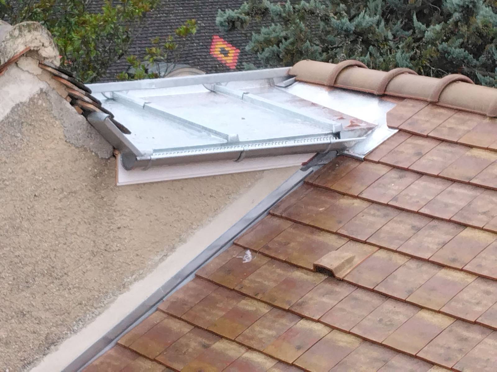 Egalement un puit de lumière situé au dessus d'une montée d'escalier a entièrement été refait. La toiture à tasseaux et l'entourage de la fenêtre de toit ont entièrement été préparé en atelier et ajusté surplace. Une seconde couverture à tasseaux a également été réalisé sur un dessus de mur ne pouvant recevoir une couvertine en tuiles, du fait de sa faible pente.